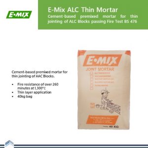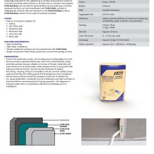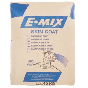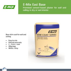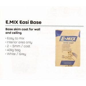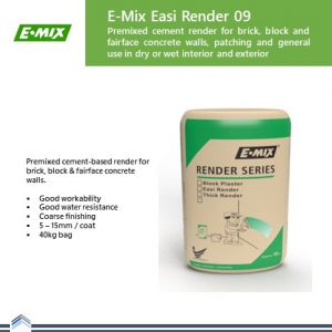 E.MIX EASI BASE is high quality water resistant cement-based thin plaster especially intended for thin plastering or surface improvement works to concrete and block wall surfaces or as final coat on cement-sand plaster. E.MIX EASI BASE can be used for general filling up and patching. A harden plastered surface can be smoothened with E.MIX FINISH, painted or wallpapered. Ceramic tiles can be fixed on the E.MIX EASI BASE surface. E.MIX EASI BASE should not be used on painted surfaces.