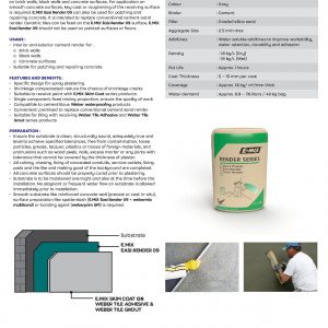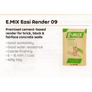 E.MIX EASI RENDER 09 is a high quality cement-based render for application on brick walls, block walls and concrete surfaces. For application on smooth concrete surfaces, key coat or roughening of the receiving surface is required. E.MIX EASI RENDER 09 can also be used for patching and repairing concrete. It is intended to replace conventional cement-sand render. Ceramic tiles can be fixed on the E.MIX EASI RENDER 09 surface. E.MIX EASI RENDER 09 should not be used on painted surfaces or floors.
