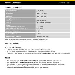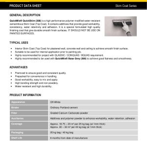 QuickMix® QuickSkim (388) is a high performance polymer-modified water-resistant cementitious  Skim Coat (Top Coat). It contains additives that provide good workability, consistency, water retentivity and adhesion. It is a special formulated high quality finishing coat that give durable smooth finish surfaces. IT SHOULD NOT BE USE ON PAINTED SURFACES.